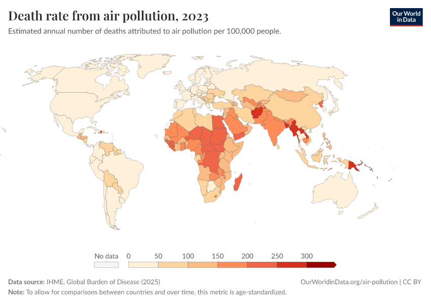 In the interactive map, we show death rates from air pollution across the world, measured as the number of deaths per 100,000 people in a given country or region.