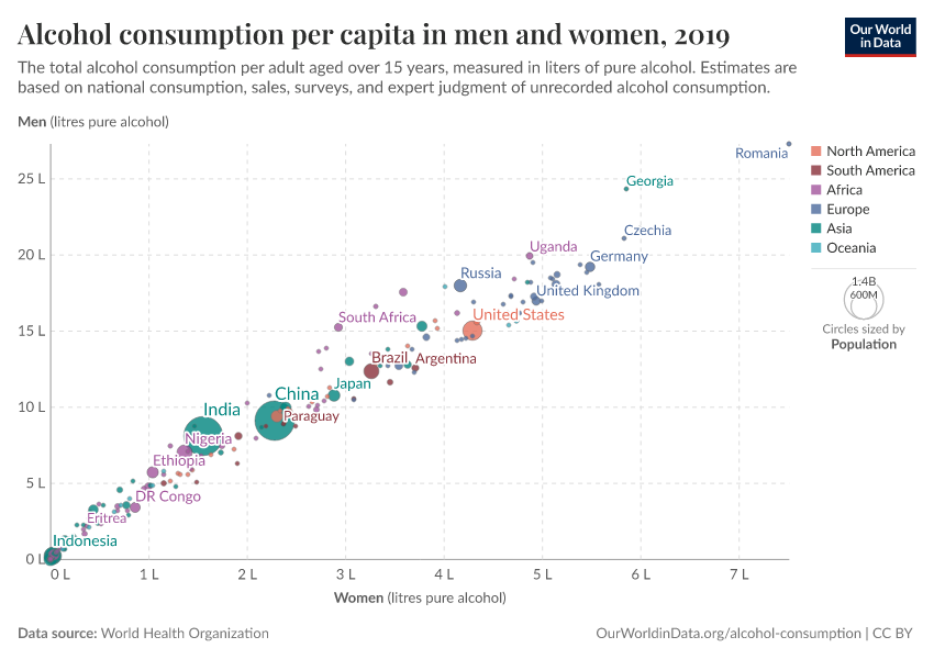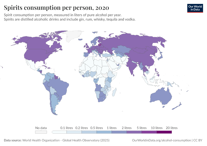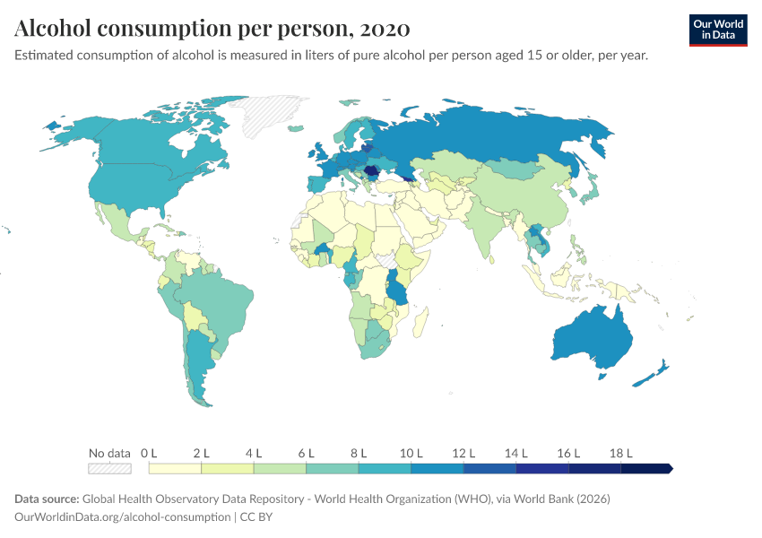 This interactive map shows the annual average alcohol consumption of alcohol, expressed per person aged 15 years or older. To account for the differences in alcohol content of different alcoholic drinks (e.g., beer, wine, spirits), this is reported in liters of pure alcohol per year.