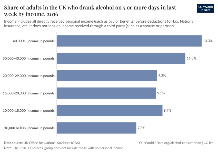 However, when we look at consumption data within given countries, we sometimes do see a clear income correlation. Taking 2016 data in the UK as an example, we see that people within higher income brackets tend to drink more frequently. This correlation is also likely to be influenced by other lifestyle determinants and habits; the UK ONS also reports that when grouped by education status, those with a university tend to drink more in total and more frequently than those of lower education status. There are also differences when grouped by profession: individuals in managerial or professional positions tend to drink more frequently than those in intermediate or manual labor roles.4