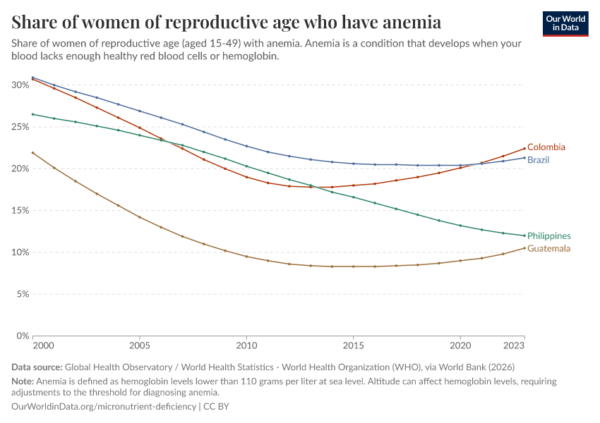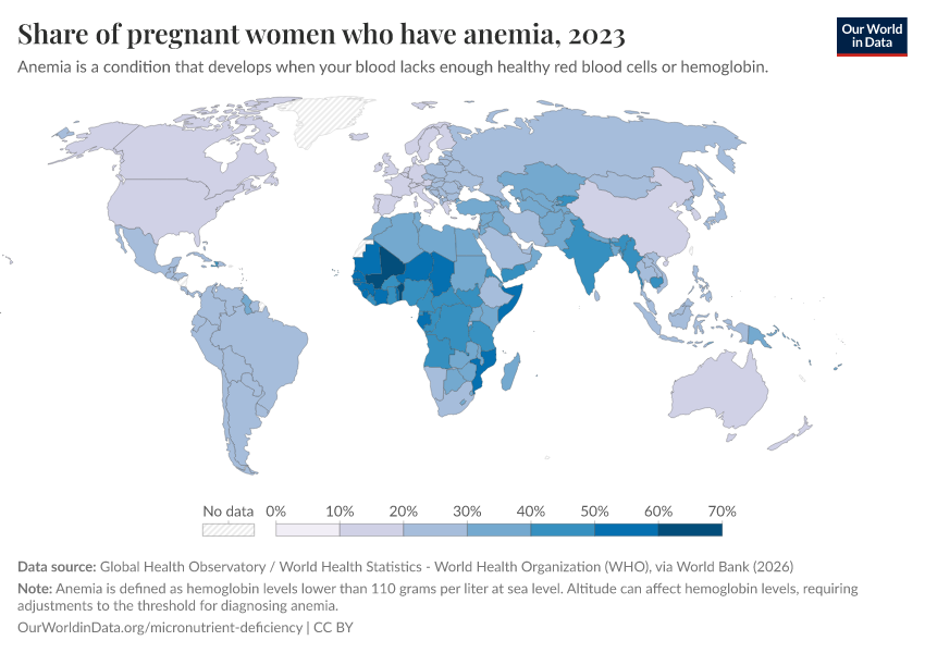 However, progress in reducing rates of anemia has been incredibly slow in recent decades. Globally, the share of pregnant women and women of reproductive age who are anemic has not changed since 2000.