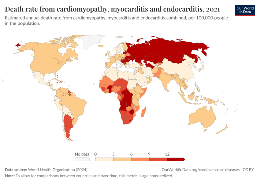The map shows the estimated death rate from these conditions combined. You can see that death rates tend to be higher in Russia, Eastern Europe, and Southern Africa.