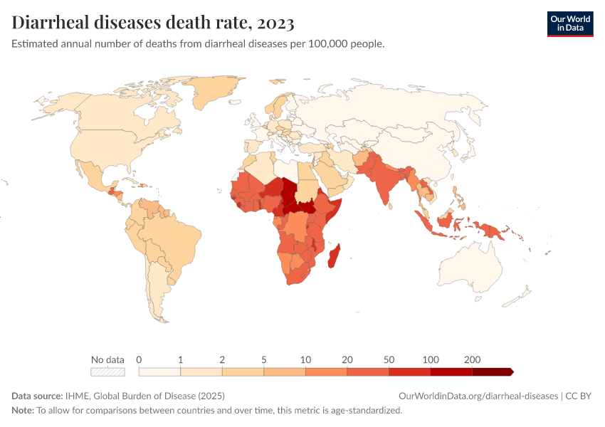 This page shows estimates of diarrheal death rates worldwide and the pathogens that cause them. We also offer data on access to public health measures and how they have changed.