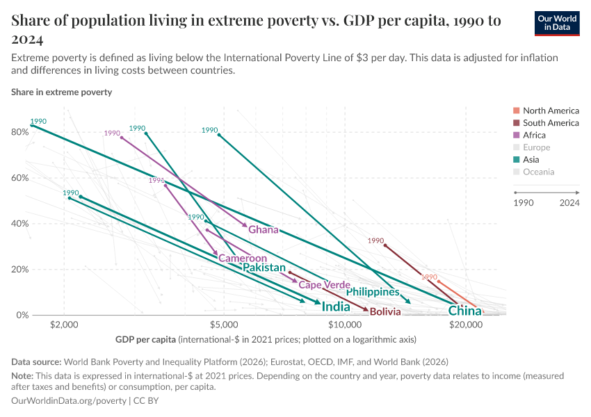 Extreme poverty declined in the last three decades because, back in the 1990s, the majority of the poorest people on the planet lived in countries that subsequently achieved very fast economic growth. In Indonesia and China, more than two-thirds of the population lived in extreme poverty. But these economies then grew rapidly, so that by today, the share has declined to less than 10%. Other large Asian countries — including India, Pakistan, Bangladesh, and the Philippines — also achieved strong growth, and as a consequence, the share living in extreme poverty declined rapidly. Much of the progress happened in Asia, but conditions in other regions improved too: the share living in extreme poverty also declined in Ghana, Cape Verde, Cameroon, Panama, Bolivia, Mexico, Brazil, and many other countries.
