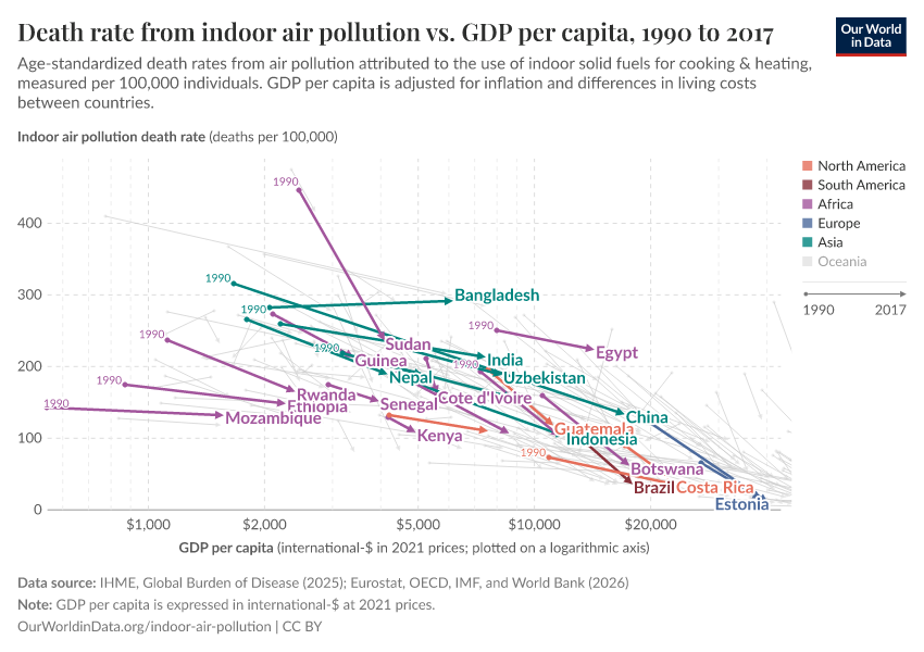 The world is solving this problem. We see this in the chart. Strong economic growth made people around the world richer, and the death rate from indoor air pollution declined.