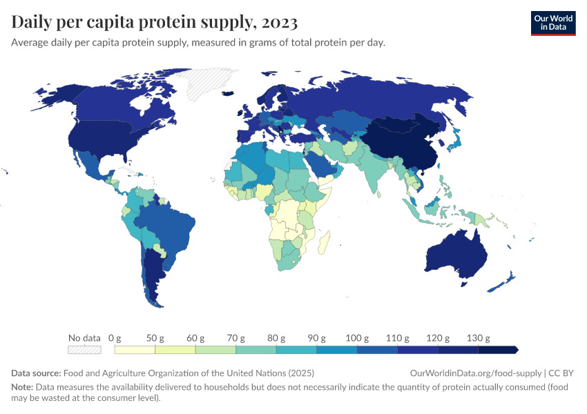 In this interactive map, we see the differences in how much protein each person gets every day in different countries.