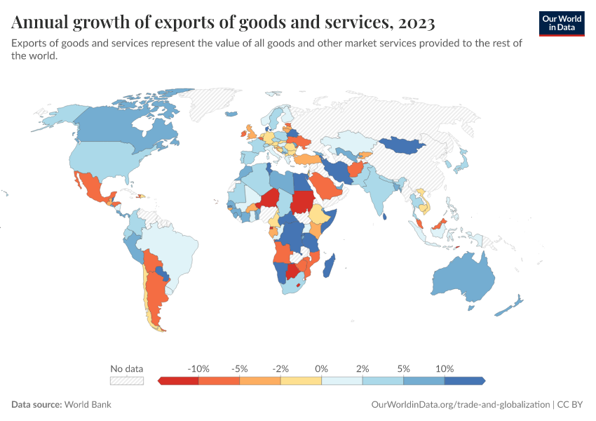 “Data Page: Annual growth of exports of goods and services”. Our World in Data (2026). Data adapted from World Bank. Retrieved from https://who-regions.owid.pages.dev:8789/20260304-094028/grapher/annual-growth-of-exports-of-goods-and-services.html [online resource] (archived on March 4, 2026).How to cite this data