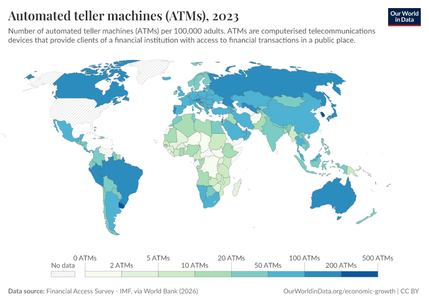 “Data Page: Automated teller machines (ATMs)”. Our World in Data (2026). Data adapted from Financial Access Survey - IMF, via World Bank. Retrieved from https://who-regions.owid.pages.dev:8789/20260304-094028/grapher/automated-teller-machines-atms-per-100000-adults.html [online resource] (archived on March 4, 2026).How to cite this data