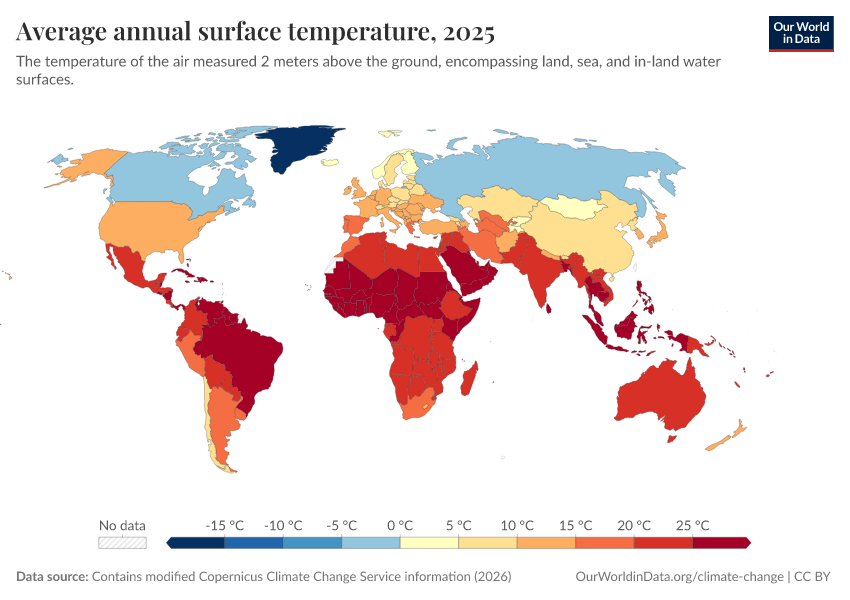 Contains modified Copernicus Climate Change Service information (2025) – with major processing by Our World in Data. “Average annual surface temperature” [dataset]. Contains modified Copernicus Climate Change Service information, “ERA5 monthly averaged data on single levels from 1940 to present 2” [original data]. Retrieved March 10, 2026 from https://who-regions.owid.pages.dev:8789/20260304-094028/grapher/average-annual-surface-temperature.html (archived on March 4, 2026).