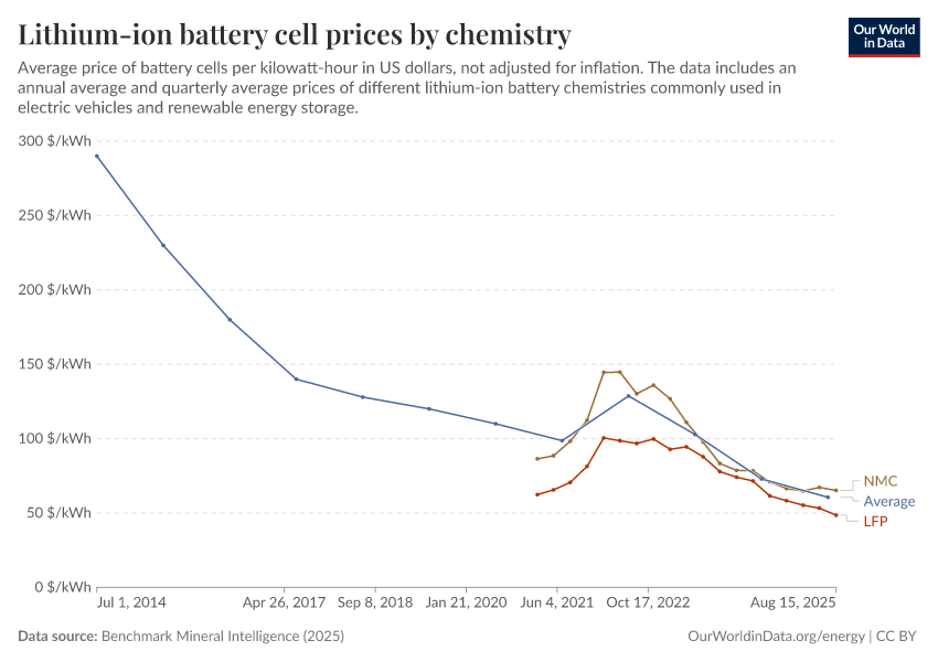 Benchmark Mineral Intelligence (2025) – with minor processing by Our World in Data. “Lithium-ion battery cell prices by chemistry” [dataset]. Benchmark Mineral Intelligence, “Lithium-ion battery prices”; Benchmark Mineral Intelligence, “Battery prices by chemistry” [original data]. Retrieved March 10, 2026 from https://who-regions.owid.pages.dev:8789/20260304-094028/grapher/average-battery-cell-price.html (archived on March 4, 2026).