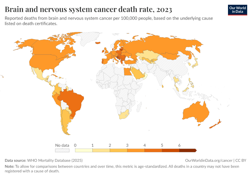 WHO Mortality Database (2025) – with minor processing by Our World in Data. “Brain and nervous system cancer death rate” [dataset]. WHO Mortality Database, “WHO Mortality Database” [original data]. Retrieved March 10, 2026 from https://who-regions.owid.pages.dev:8789/20260304-094028/grapher/brain-and-nervous-system-cancer-death-rate.html (archived on March 4, 2026).