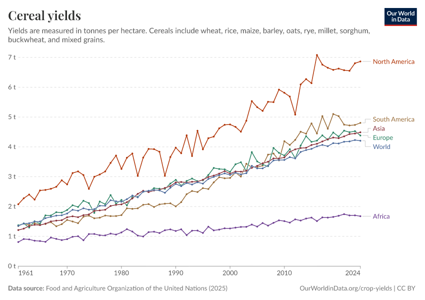 Food and Agriculture Organization of the United Nations (2025) – with major processing by Our World in Data. “Cereal yields – UN FAO” [dataset]. Food and Agriculture Organization of the United Nations, “Production: Crops and livestock products” [original data]. Retrieved March 10, 2026 from https://who-regions.owid.pages.dev:8789/20260304-094028/grapher/cereal-yield.html (archived on March 4, 2026).