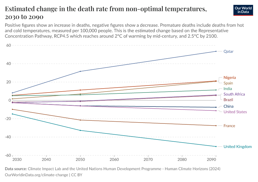 “Data Page: Estimated change in the death rate from non-optimal temperatures”. Our World in Data (2026). Data adapted from Climate Impact Lab and the United Nations Human Development Programme. Retrieved from https://who-regions.owid.pages.dev:8789/20260304-094028/grapher/change-heat-death-rate.html [online resource] (archived on March 4, 2026).How to cite this data