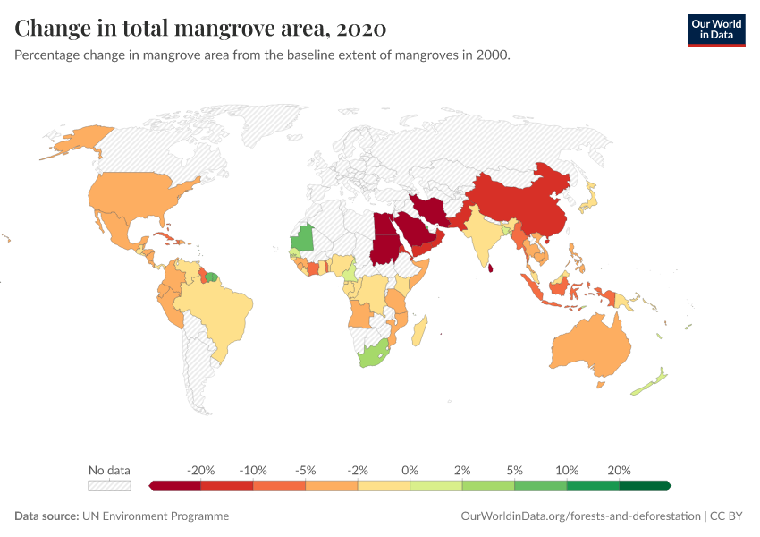 “Data Page: Change in total mangrove area”. Our World in Data (2026). Data adapted from UN Environment Programme. Retrieved from https://who-regions.owid.pages.dev:8789/20260304-094028/grapher/change-in-total-mangrove-area.html [online resource] (archived on March 4, 2026).How to cite this data