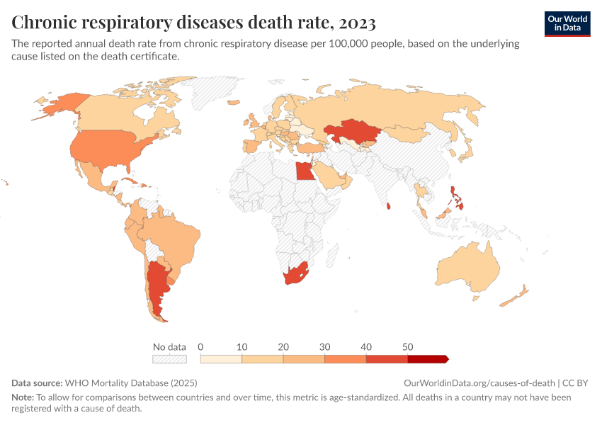“Data Page: Chronic respiratory diseases death rate”, part of the following publication: Saloni Dattani, Fiona Spooner, Hannah Ritchie, and Max Roser (2023) - “Causes of Death”. Data adapted from WHO Mortality Database. Retrieved from https://who-regions.owid.pages.dev:8789/20260304-094028/grapher/chronic-respiratory-diseases-death-rate-who-mdb.html [online resource] (archived on March 4, 2026).How to cite this data