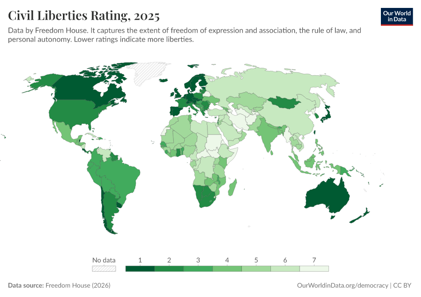 Freedom House (2025) – processed by Our World in Data. “Civil liberties rating” [dataset]. Freedom House, “Freedom in the World” [original data]. Retrieved March 10, 2026 from https://who-regions.owid.pages.dev:8789/20260304-094028/grapher/civil-liberties-rating-fh.html (archived on March 4, 2026).