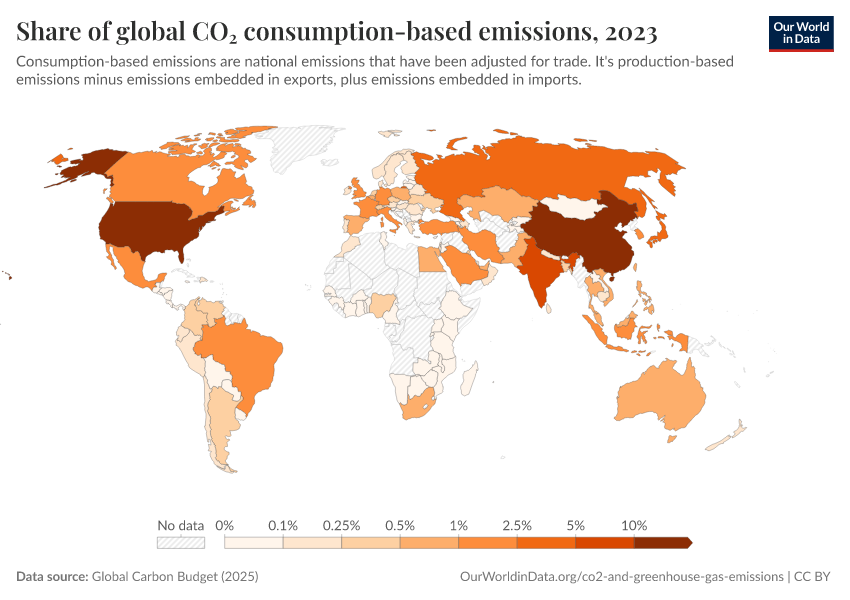 “Data Page: Share of global CO₂ consumption-based emissions”, part of the following publication: Hannah Ritchie, Pablo Rosado, and Max Roser (2023) - “CO₂ and Greenhouse Gas Emissions”. Data adapted from Global Carbon Project. Retrieved from https://who-regions.owid.pages.dev:8789/20260304-094028/grapher/co2-consumption-share.html [online resource] (archived on March 4, 2026).How to cite this data