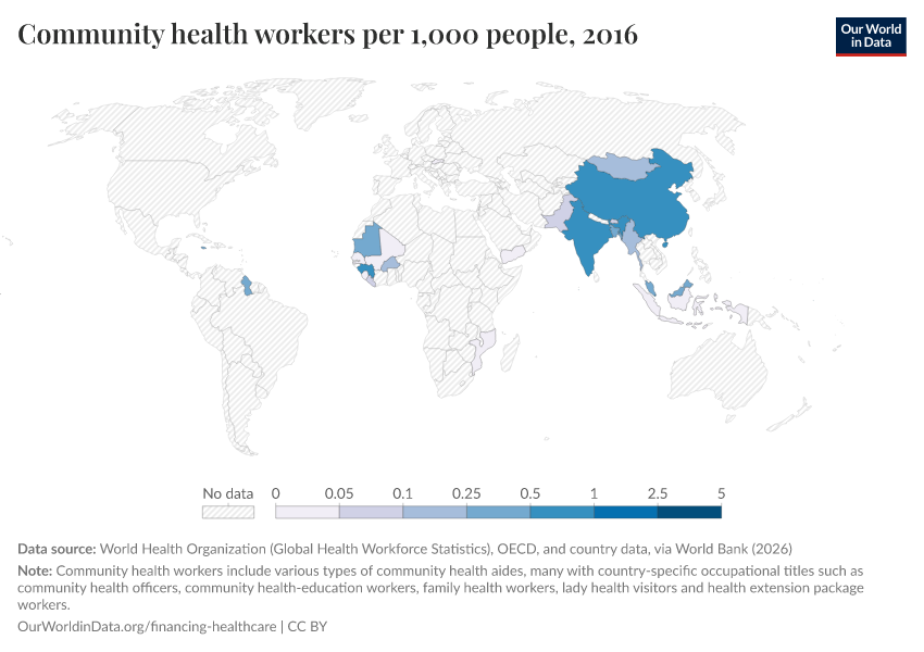 “Data Page: Community health workers per 1,000 people”. Our World in Data (2026). Data adapted from World Health Organization (Global Health Workforce Statistics), OECD, and country data, via World Bank. Retrieved from https://who-regions.owid.pages.dev:8789/20260304-094028/grapher/community-health-workers.html [online resource] (archived on March 4, 2026).How to cite this data