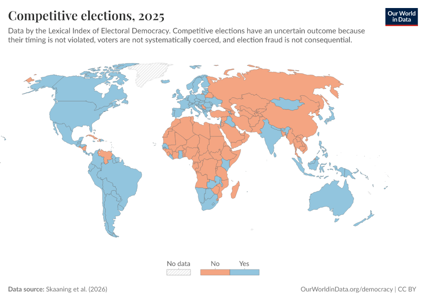Skaaning et al. (2025) – processed by Our World in Data. “Competitive elections” [dataset]. Skaaning et al., “Lexical Index of Electoral Democracy (LIED) v6.8” [original data]. Retrieved March 10, 2026 from https://who-regions.owid.pages.dev:8789/20260304-094028/grapher/competitive-elections-lexical.html (archived on March 4, 2026).