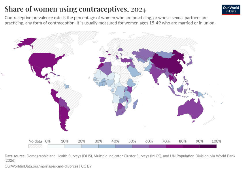 “Data Page: Share of women using contraceptives”. Our World in Data (2026). Data adapted from Demographic and Health Surveys (DHS), Multiple Indicator Cluster Surveys (MICS), and UN Population Division, via World Bank. Retrieved from https://who-regions.owid.pages.dev:8789/20260304-094028/grapher/contraceptive-prevalence-any-methods-of-women-ages-15-49.html [online resource] (archived on March 4, 2026).How to cite this data