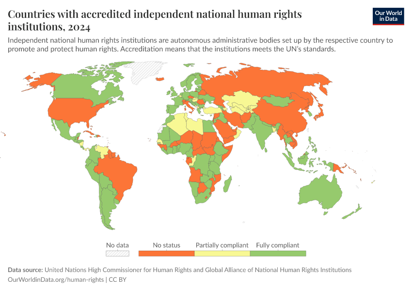 “Data Page: Countries with accredited independent national human rights institutions”. Our World in Data (2026). Data adapted from United Nations High Commissioner for Human Rights and Global Alliance of National Human Rights Institutions. Retrieved from https://who-regions.owid.pages.dev:8789/20260304-094028/grapher/countries-with-independent-national-human-rights-institution.html [online resource] (archived on March 4, 2026).How to cite this data