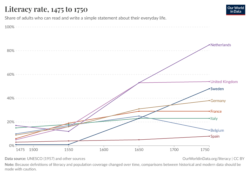 • 1451–1800: Direct literacy surveys did not exist during this period. Data for Great Britain, Ireland, France, Belgium, the Netherlands, Germany, Italy, Spain, Sweden, and Poland comes from the "Charting the Rise of the West" study. The authors estimated literacy rates using manuscript and book production as indirect indicators. While more books likely indicated more readers, this approach has clear limitations.