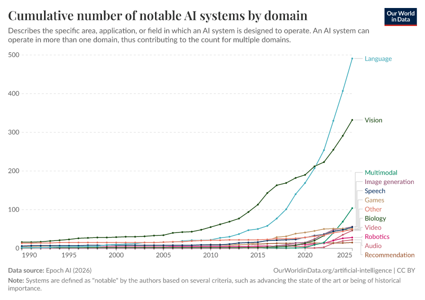 Epoch AI (2025) – with major processing by Our World in Data. “Cumulative number of notable AI systems by domain” [dataset]. Epoch AI, “Parameter, Compute and Data Trends in Machine Learning” [original data]. Retrieved March 10, 2026 from https://who-regions.owid.pages.dev:8789/20260308-063423/grapher/cumulative-number-of-notable-ai-systems-by-domain.html (archived on March 8, 2026).