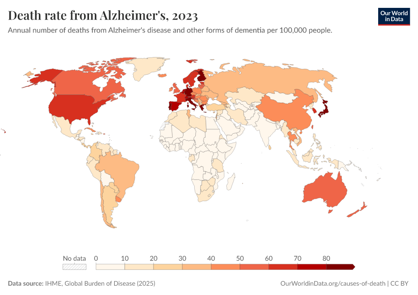 IHME, Global Burden of Disease (2025) – with major processing by Our World in Data. “Death rate from Alzheimer's” [dataset]. IHME, Global Burden of Disease, “Global Burden of Disease - Deaths” [original data]. Retrieved March 10, 2026 from https://who-regions.owid.pages.dev:8789/20260304-094028/grapher/death-rate-from-alzheimers-other-dementias-gbd.html (archived on March 4, 2026).