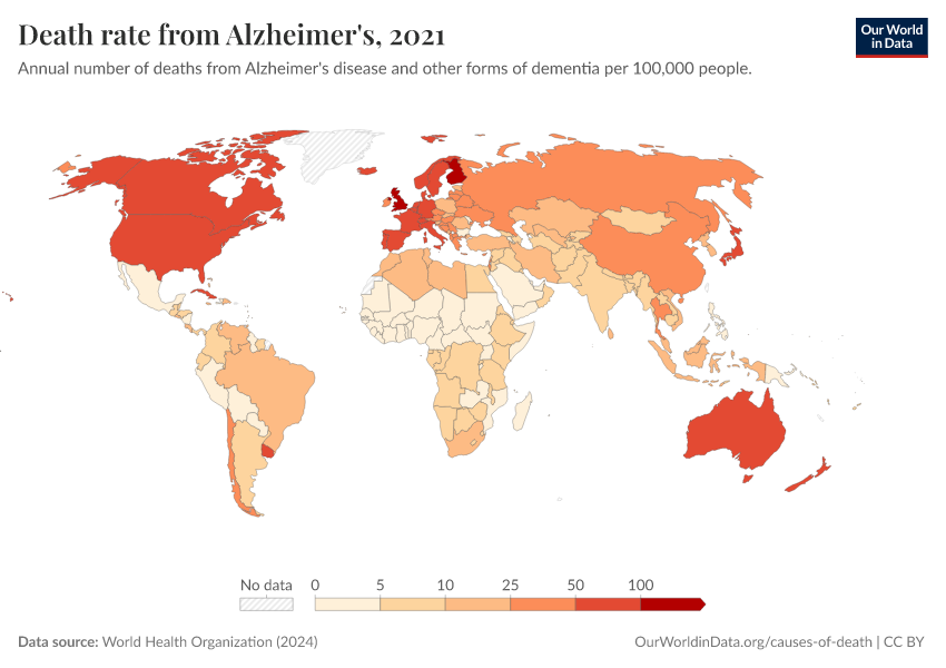 World Health Organization (2024) – with major processing by Our World in Data. “Death rate from Alzheimer's” [dataset]. World Health Organization, “Global Health Estimates” [original data]. Retrieved March 10, 2026 from https://who-regions.owid.pages.dev:8789/20260304-094028/grapher/death-rate-from-alzheimers-other-dementias-ghe.html (archived on March 4, 2026).