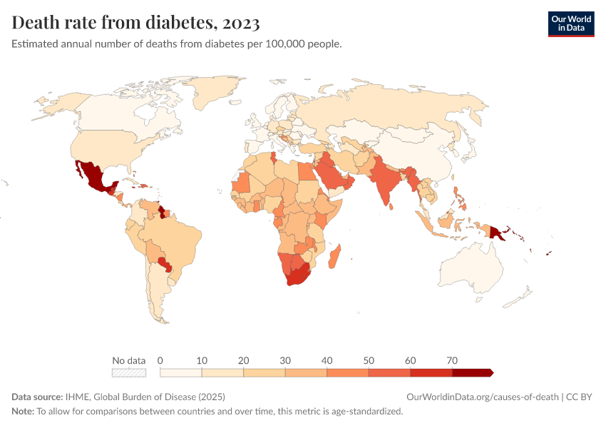 IHME, Global Burden of Disease (2025) – with major processing by Our World in Data. “Death rate from diabetes” [dataset]. IHME, Global Burden of Disease, “Global Burden of Disease - Deaths” [original data]. Retrieved March 10, 2026 from https://who-regions.owid.pages.dev:8789/20260304-094028/grapher/death-rate-from-diabetes.html (archived on March 4, 2026).