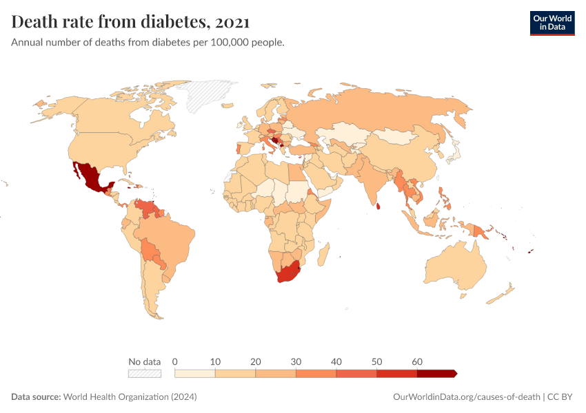 “Data Page: Death rate from diabetes”, part of the following publication: Esteban Ortiz-Ospina and Max Roser (2016) - “Global Health”. Data adapted from World Health Organization. Retrieved from https://who-regions.owid.pages.dev:8789/20260304-094028/grapher/death-rate-from-diabetes-ghe.html [online resource] (archived on March 4, 2026).How to cite this data