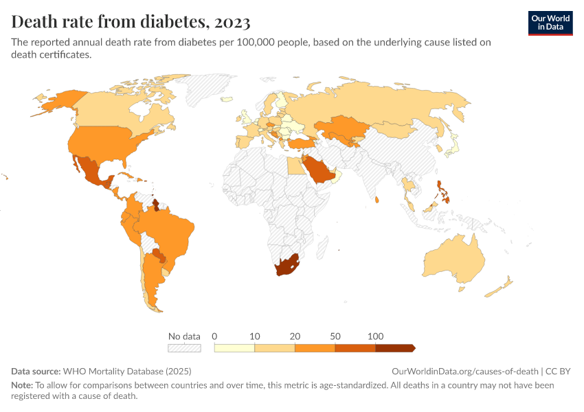“Data Page: Death rate from diabetes”, part of the following publication: Saloni Dattani, Fiona Spooner, Hannah Ritchie, and Max Roser (2023) - “Causes of Death”. Data adapted from WHO Mortality Database. Retrieved from https://who-regions.owid.pages.dev:8789/20260304-094028/grapher/death-rate-from-diabetes-who-mdb.html [online resource] (archived on March 4, 2026).How to cite this data