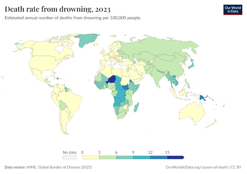 IHME, Global Burden of Disease (2025) – with major processing by Our World in Data. “Death rate from drowning” [dataset]. IHME, Global Burden of Disease, “Global Burden of Disease - Deaths” [original data]. Retrieved March 10, 2026 from https://who-regions.owid.pages.dev:8789/20260304-094028/grapher/death-rate-from-drowning.html (archived on March 4, 2026).