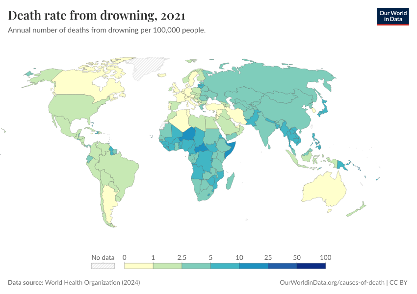 World Health Organization (2024) – with major processing by Our World in Data. “Death rate from drowning” [dataset]. World Health Organization, “Global Health Estimates” [original data]. Retrieved March 10, 2026 from https://who-regions.owid.pages.dev:8789/20260304-094028/grapher/death-rate-from-drowning-ghe.html (archived on March 4, 2026).
