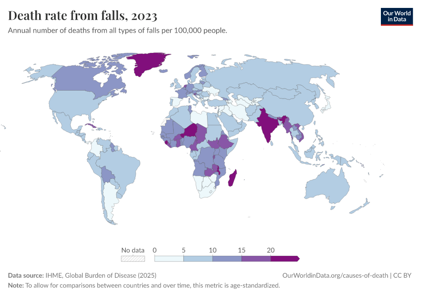 IHME, Global Burden of Disease (2025) – with major processing by Our World in Data. “Death rate from falls” [dataset]. IHME, Global Burden of Disease, “Global Burden of Disease - Deaths” [original data]. Retrieved March 10, 2026 from https://who-regions.owid.pages.dev:8789/20260304-094028/grapher/death-rate-from-falls-gbd.html (archived on March 4, 2026).