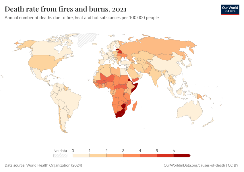 World Health Organization (2024) – with major processing by Our World in Data. “Death rate from fires and burns” [dataset]. World Health Organization, “Global Health Estimates” [original data]. Retrieved March 10, 2026 from https://who-regions.owid.pages.dev:8789/20260304-094028/grapher/death-rate-from-fires-and-burns-who.html (archived on March 4, 2026).