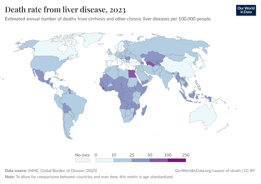 IHME, Global Burden of Disease (2025) – with major processing by Our World in Data. “Death rate from liver disease” [dataset]. IHME, Global Burden of Disease, “Global Burden of Disease - Deaths” [original data]. Retrieved March 10, 2026 from https://who-regions.owid.pages.dev:8789/20260304-094028/grapher/death-rate-from-liver-disease.html (archived on March 4, 2026).