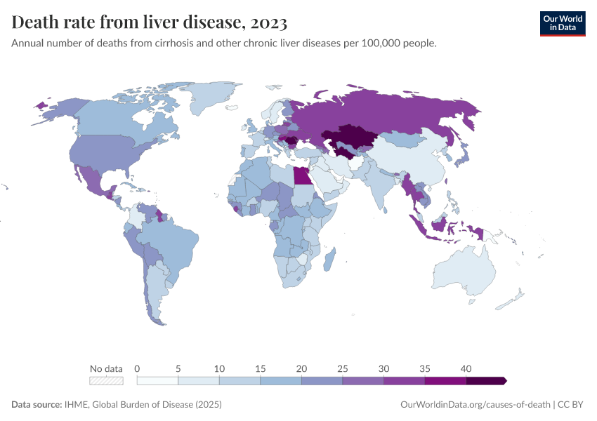 IHME, Global Burden of Disease (2025) – with major processing by Our World in Data. “Death rate from liver disease” [dataset]. IHME, Global Burden of Disease, “Global Burden of Disease - Deaths” [original data]. Retrieved March 10, 2026 from https://who-regions.owid.pages.dev:8789/20260304-094028/grapher/death-rate-from-liver-disease-gbd.html (archived on March 4, 2026).