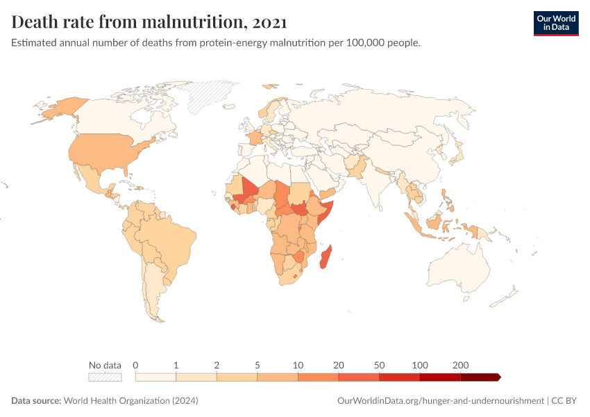 World Health Organization (2024) – with major processing by Our World in Data. “Death rate from malnutrition” [dataset]. World Health Organization, “Global Health Estimates” [original data]. Retrieved March 10, 2026 from https://who-regions.owid.pages.dev:8789/20260304-094028/grapher/death-rate-from-malnutrition-ghe.html (archived on March 4, 2026).