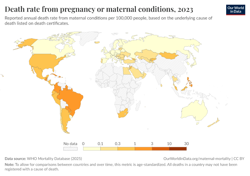 WHO Mortality Database (2025) – with minor processing by Our World in Data. “Death rate from pregnancy or maternal conditions” [dataset]. WHO Mortality Database, “WHO Mortality Database” [original data]. Retrieved March 10, 2026 from https://who-regions.owid.pages.dev:8789/20260304-094028/grapher/death-rate-from-maternal-disorders.html (archived on March 4, 2026).