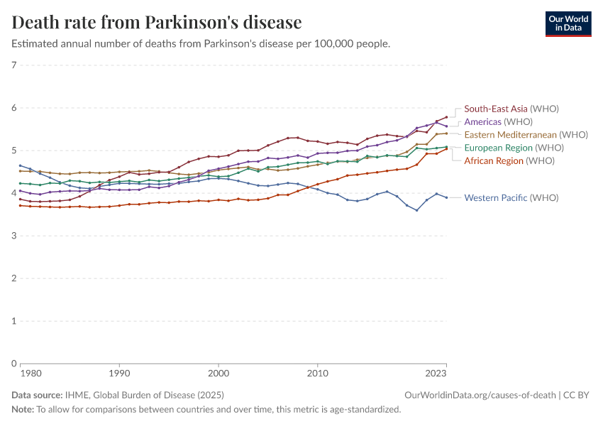 IHME, Global Burden of Disease (2025) – with major processing by Our World in Data. “Death rate from Parkinson's disease” [dataset]. IHME, Global Burden of Disease, “Global Burden of Disease - Deaths” [original data]. Retrieved March 10, 2026 from https://who-regions.owid.pages.dev:8789/20260304-094028/grapher/death-rate-from-parkinsons-disease.html (archived on March 4, 2026).