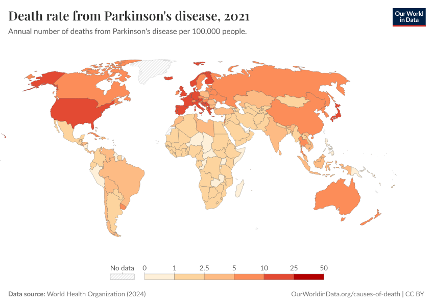 “Data Page: Death rate from Parkinson's disease”, part of the following publication: Esteban Ortiz-Ospina and Max Roser (2016) - “Global Health”. Data adapted from World Health Organization. Retrieved from https://who-regions.owid.pages.dev:8789/20260304-094028/grapher/death-rate-from-parkinsons-disease-ghe.html [online resource] (archived on March 4, 2026).How to cite this data