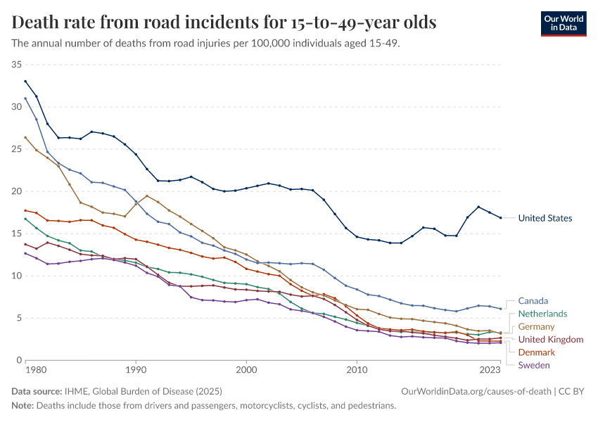 IHME, Global Burden of Disease (2025) – with major processing by Our World in Data. “Death rate from road incidents for 15-to-49-year olds” [dataset]. IHME, Global Burden of Disease, “Global Burden of Disease - Deaths” [original data]. Retrieved March 10, 2026 from https://who-regions.owid.pages.dev:8789/20260304-094028/grapher/death-rate-from-road-accidents-for-15--to-49-year-olds.html (archived on March 4, 2026).