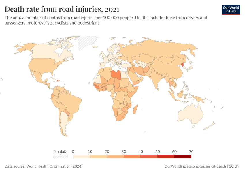 “Data Page: Death rate from road injuries”, part of the following publication: Esteban Ortiz-Ospina and Max Roser (2016) - “Global Health”. Data adapted from World Health Organization. Retrieved from https://who-regions.owid.pages.dev:8789/20260304-094028/grapher/death-rate-from-road-accidents-ghe.html [online resource] (archived on March 4, 2026).How to cite this data