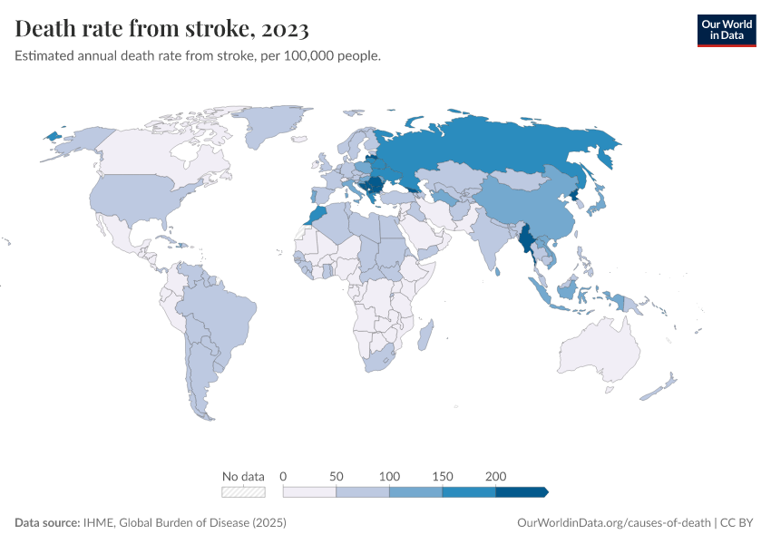 IHME, Global Burden of Disease (2025) – with major processing by Our World in Data. “Death rate from stroke” [dataset]. IHME, Global Burden of Disease, “Global Burden of Disease - Deaths” [original data]. Retrieved March 10, 2026 from https://who-regions.owid.pages.dev:8789/20260304-094028/grapher/death-rate-from-strokes.html (archived on March 4, 2026).