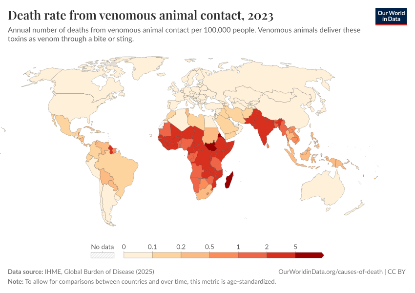 IHME, Global Burden of Disease (2025) – with major processing by Our World in Data. “Death rate from venomous animal contact” [dataset]. IHME, Global Burden of Disease, “Global Burden of Disease - Deaths” [original data]. Retrieved March 10, 2026 from https://who-regions.owid.pages.dev:8789/20260304-094028/grapher/death-rate-from-venomous-animal.html (archived on March 4, 2026).