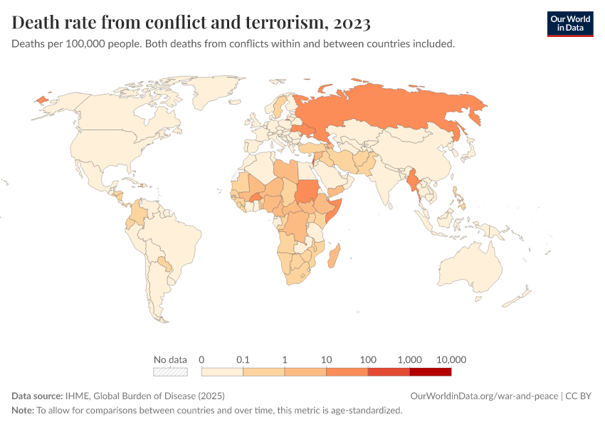 “Data Page: Death rate from conflict and terrorism”, part of the following publication: Esteban Ortiz-Ospina and Max Roser (2016) - “Global Health”. Data adapted from IHME, Global Burden of Disease. Retrieved from https://who-regions.owid.pages.dev:8789/20260304-094028/grapher/death-rates-from-conflict-and-terrorism-gbd.html [online resource] (archived on March 4, 2026).