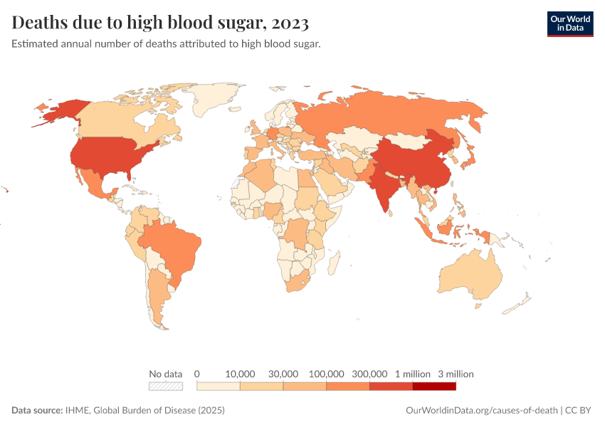 IHME, Global Burden of Disease (2025) – with major processing by Our World in Data. “Deaths due to high blood sugar” [dataset]. IHME, Global Burden of Disease, “Global Burden of Disease - Risk Factors - Deaths” [original data]. Retrieved March 10, 2026 from https://who-regions.owid.pages.dev:8789/20260304-094028/grapher/deaths-due-to-high-blood-sugar.html (archived on March 4, 2026).