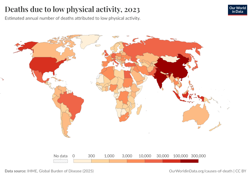 “Data Page: Deaths due to low physical activity”, part of the following publication: Esteban Ortiz-Ospina and Max Roser (2016) - “Global Health”. Data adapted from IHME, Global Burden of Disease. Retrieved from https://who-regions.owid.pages.dev:8789/20260304-094028/grapher/deaths-due-to-low-physical-activity.html [online resource] (archived on March 4, 2026).How to cite this data