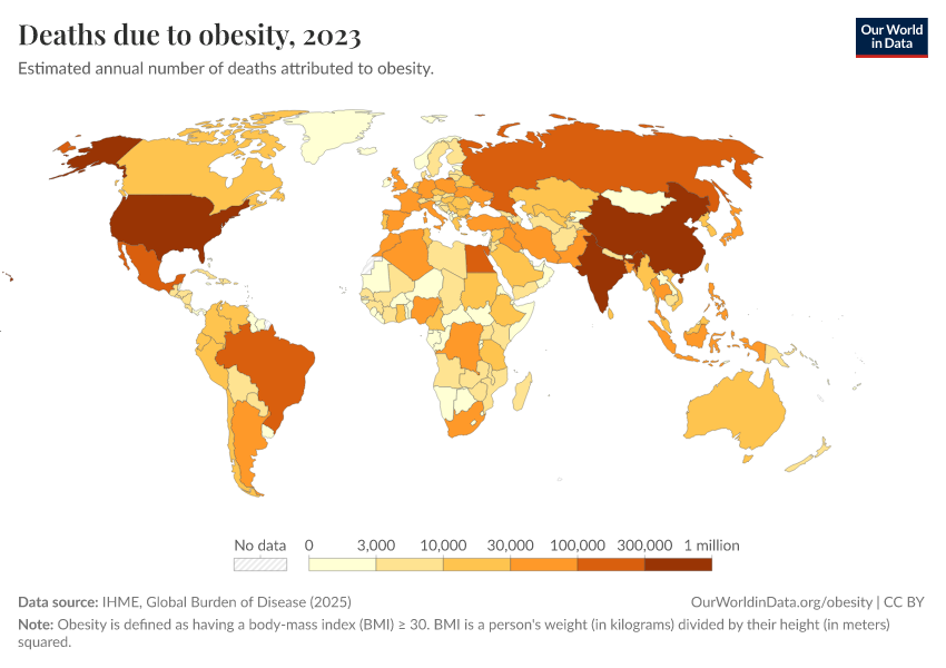 IHME, Global Burden of Disease (2025) – with major processing by Our World in Data. “Deaths due to obesity” [dataset]. IHME, Global Burden of Disease, “Global Burden of Disease - Risk Factors - Deaths” [original data]. Retrieved March 10, 2026 from https://who-regions.owid.pages.dev:8789/20260304-094028/grapher/deaths-due-to-obesity.html (archived on March 4, 2026).