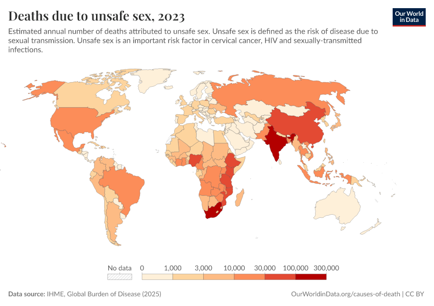 “Data Page: Deaths due to unsafe sex”, part of the following publication: Esteban Ortiz-Ospina and Max Roser (2016) - “Global Health”. Data adapted from IHME, Global Burden of Disease. Retrieved from https://who-regions.owid.pages.dev:8789/20260304-094028/grapher/deaths-due-to-unsafe-sex.html [online resource] (archived on March 4, 2026).How to cite this data